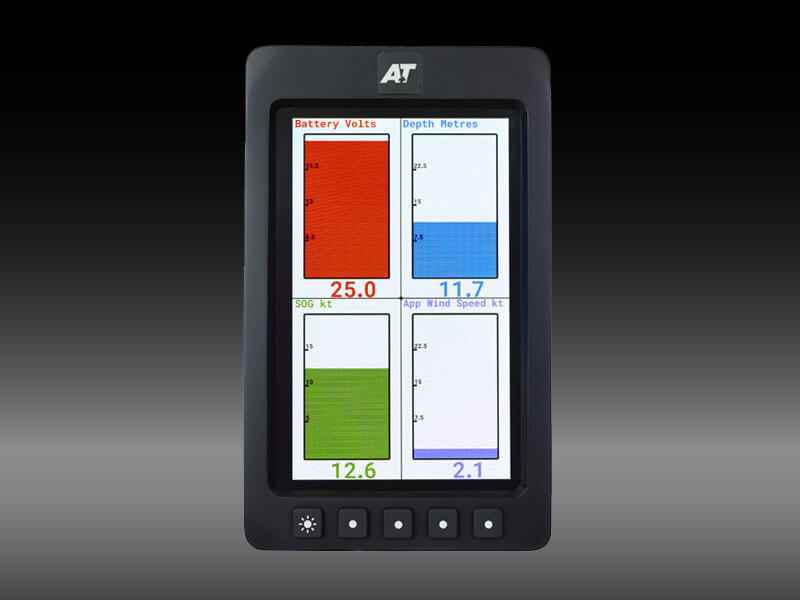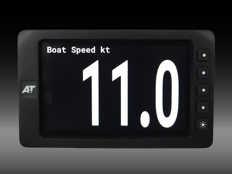 Full colour 12” large format display fits in the same footprint and front mounting as a B&G 40/40. It is fully configurable with any number of panels or graphics and is fully waterproof like the rest of the A+T display range. The lighting and viewing angles are fantastic and digits are 50% larger than a 40/40.